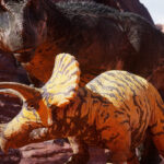 そのフリルと角はおそらく防御のために用いられ、特にティラノサウルスから身を守るのに役立っていたと考えられています。